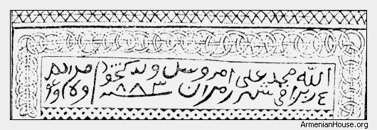 «Аллах, Мухаммед, Али, Амир-Васак, сын кетхуды Авлакума Вагудинского. Написано в месяце Рамазане 883 года (26. XI—26. XII, 1478)» (см. рис.).