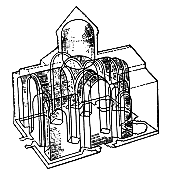открывающейся в крытую внутреннюю галерею. В довершение, архитектор уменьшил ширину этой галереи с четырех метров до двух. Тем самым его проект, как и в Анийском соборе, высвободил больше пространства под куполом. Итак, выявляются две особенности архитектурной эстетики Трдата: линейность за счет профилирования опор и арок, а также увеличенное центральное пространство.