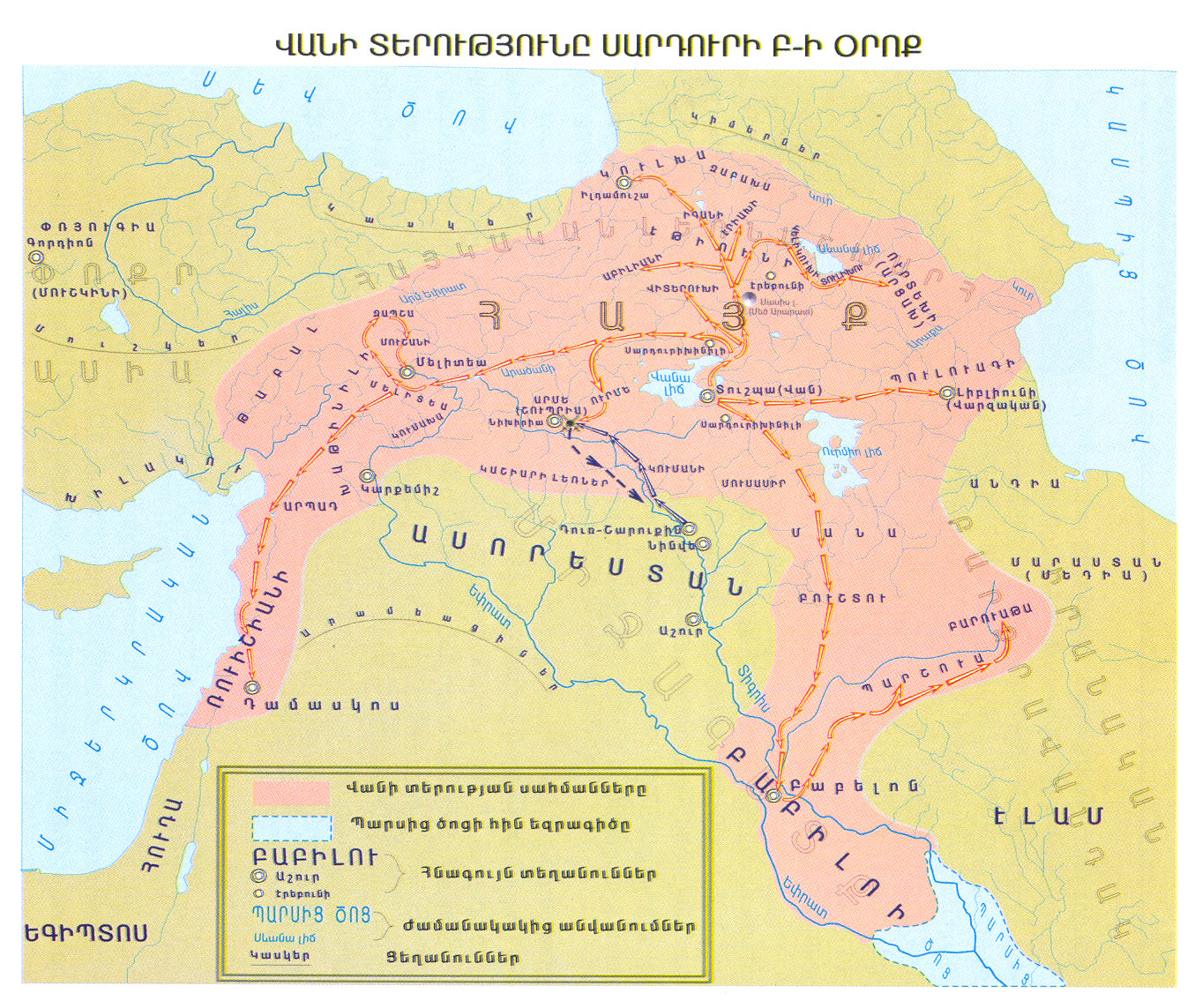 Васпуракан к западу от Персармении, рядом с Корджайк, имеет 36 областей: 1. Рештуник, 2. Тосб, 3. Будуник, 4. Арчишаковит, 5. Аговит, 6. Кугановит, 7. Арберани, 8. Дарни, 9. Бужуник, 10. Арнойотн, 11. Андзевацик, 12. Атрпатуник, 13. Еритуник, 14. Мардастан, 15. Артаз, 16. Аке, 17. Великий Албак, 18. Андзахадзор, 19. Торнаван, 20. Чуашрот, 21. Крчуник, 22. Мецнуник, 23. Палуник, 24. Гукан, 25. Агуандрот, 26. Патспаруник, 27. Арташезьян, 28. Артаваньян, 29. Бакан, 30. Гапитьян, 31. Газрикан, 32. Танкриан, 33. Варажнуник, 34. обильный вином Гохтн, 35. Нахчуан с городом того же имени, и 36. Маранд.