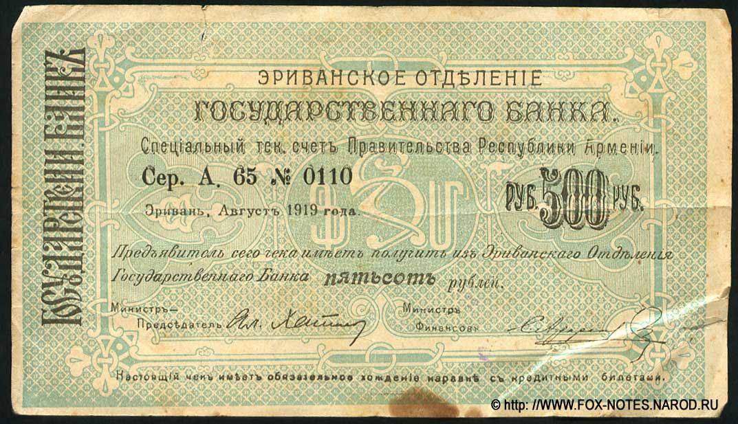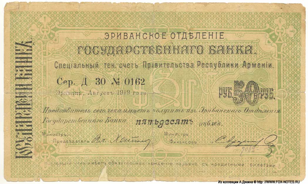 Министр финансов Джагетян, с 20.03.1919 министр финансов Араратян. Варианты в оттенках, сортах бумаги, шрифтах. |